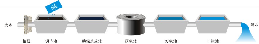 污水经格栅去除颗粒物质后,投加混凝剂将部分污染物沉淀,并加入氧化剂氧化部分酚、醛,出水至生物酶催化池,经酶促反应后,进入厌氧处理系统,出水进入好氧生物处理系统,处理后进入二沉池,进行泥水分禽后,达标排放或车间回用。